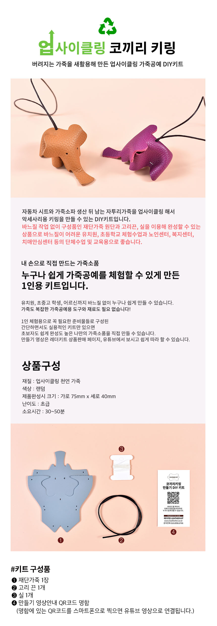 상품명[레더키트] 코끼리키링 만들기 10개(환경교육 업사이클링 천연소가죽 공예DIY키트) 색상 랜덤