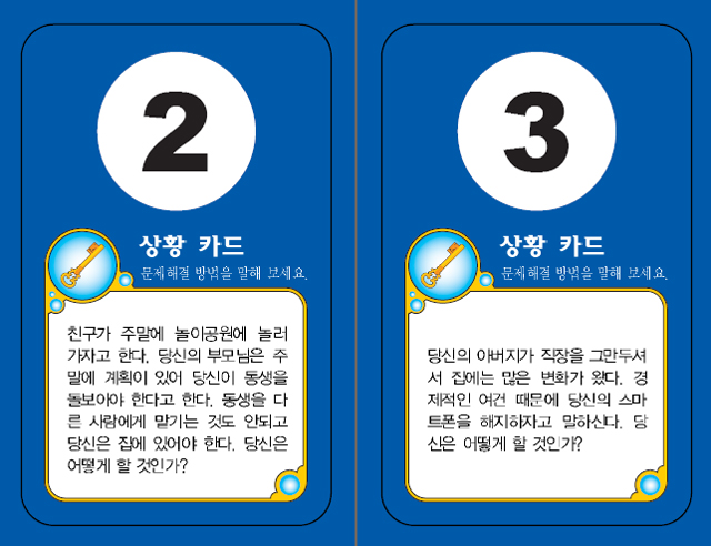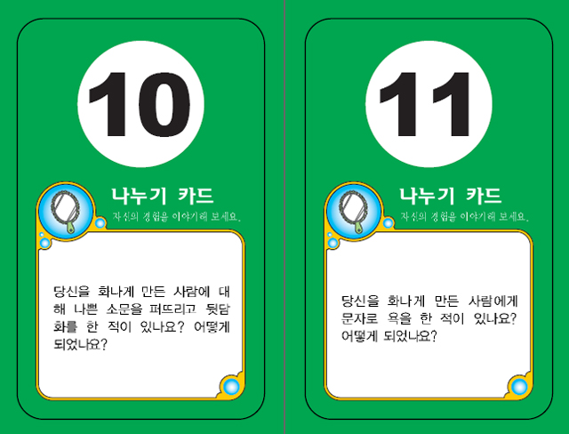 이 게임은 손에 들고 있는 카드를 바닥에 깔린 카드의 숫자 혹은 색깔과 맞다면 내려놓는 것이다. 숫자 카드는 시나리오와 질문들로 구성되어져 있고, 카드를 내려놓기 전에 적절한 반응을 해야 한다. 찬스 카드는 4가지가 있다(꽝, 추가 카드를 가져온다, 게임 방향 혹은 색깔을 바꾼다). 한 명이 마지막 카드를 내려놓으면 게임은 끝난다. 시간에 허락한다면 카드의 내용에 대해 토론할 시간을 가질 수 있다.